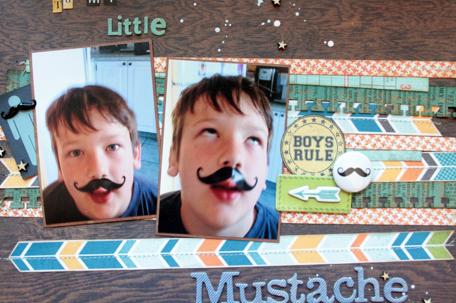 This "orange flavored" card was from the Basic Grey clippings little paper pack. Caleb's favourite colour is orange so I thought it would go great for this layout. I put an overlay on it and stitched it together with my sewing machine. I also stitched the triangles that point to my title on their for a little added texture.